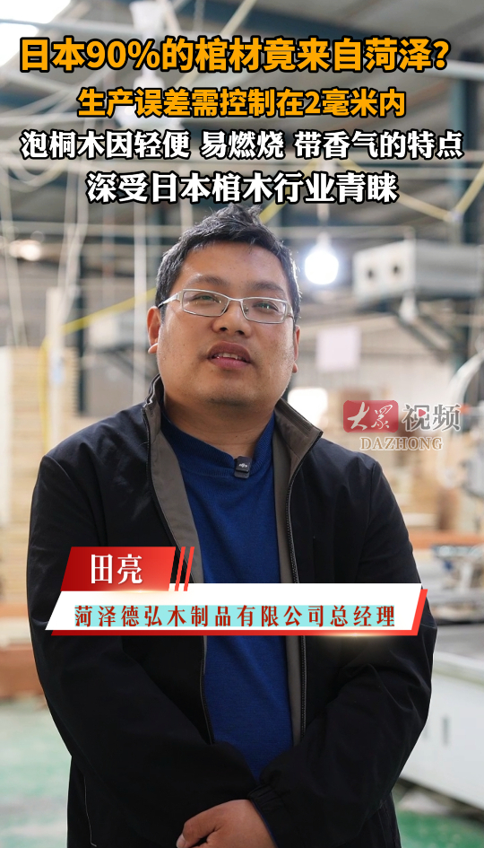 日本90%的棺材竟来自菏泽?曹县泡桐木深受日本棺木行业青睐!大众新闻 12:45现场菏泽德弘木制品有限公司总经理田亮介绍,菏泽棺材占据日本约90%的市场。作为桐木加工之乡,菏泽所产的泡桐木因轻便、易燃且自带香气的特点,深受日本棺木行业青睐。为确保品质,棺木生产过程中的误差必须控制在2毫米以内。(大众新闻记者 王梓润 石少汛 策划 马玉峰 马海燕 王兆锋)