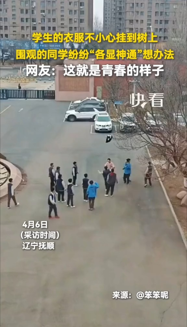 学生的衣服不小心挂到树上,围观的同学纷纷“各显神通”想办法。网友:这就是青春的样子