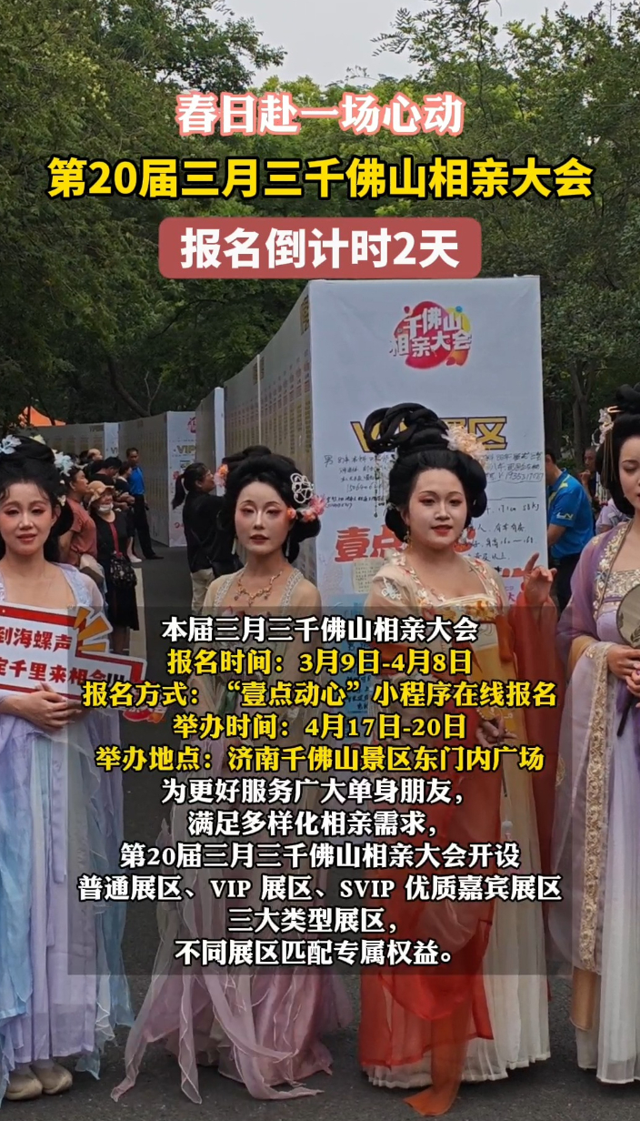 果然视频|春日赴一场心动!千佛山相亲大会报名倒计时2天大众报业·齐鲁壹点 10:48第20届三月三千佛山相亲大会报名倒计时2天!报名时间:3月9日-4月8日,报名方式:壹点动心”小程序在线报名,举办时间:4月17日-20日。举办地点:济南千佛山景区东门内广场,这个春天快来寻找你的心上人吧!