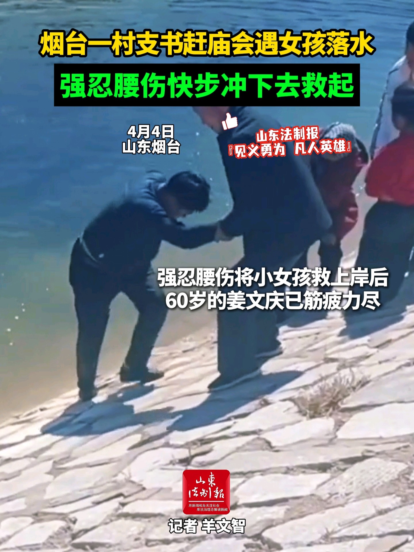 烟台一村支书赶庙会遇女孩落水,强忍腰伤快步冲下去救起 16:02 原创山东法制报 微信扫码扫码下载客户端4月4日下午,烟台蓬莱,小门家镇高家沟村60岁的村支书姜文庆在赶庙会时,发现身后水塘里一名10岁小女孩落水,便强忍腰伤冲下水施救,成功将女孩救起。(大众新闻·山东法制报记者 羊文智)