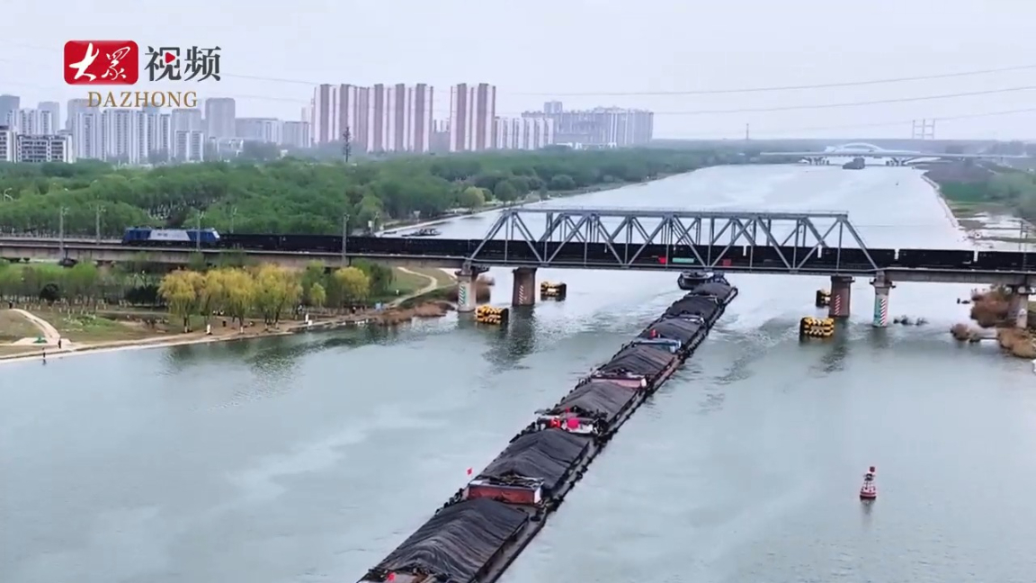 京杭运河“水上列车”偶遇新兖铁路货运列车大众新闻 04-07原创在京杭运河,航行着不少船队,这些船队为首的是一艘动力船,与后面七八艘或者十余艘无动力驳船通过缆绳首尾相连,船队全长有时超过400米,每艘船如一节节车厢,船队拖运能力多达万余吨,超过货运列车。 济宁当地人形象地把这种船队称为“水上列车”。(大众新闻记者 吕光社 实习生 傅宇杰)