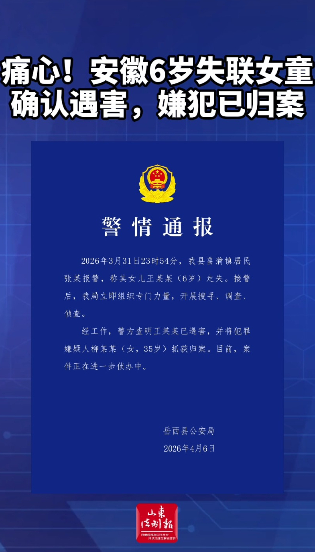 痛心!安徽6岁失联女童确认遇害,嫌犯已归案山东法制报 | 16:00 大众新闻·山东法制报 微信扫码扫码下载客户端据人民日报4月7日消息,近日,安徽省安庆市岳西县菖蒲镇一6岁女童失联。6日晚,岳西公安微信公众号发布通报称,该女童已遇害,犯罪嫌疑人柳某某(女,35岁)已被警方抓获归案。