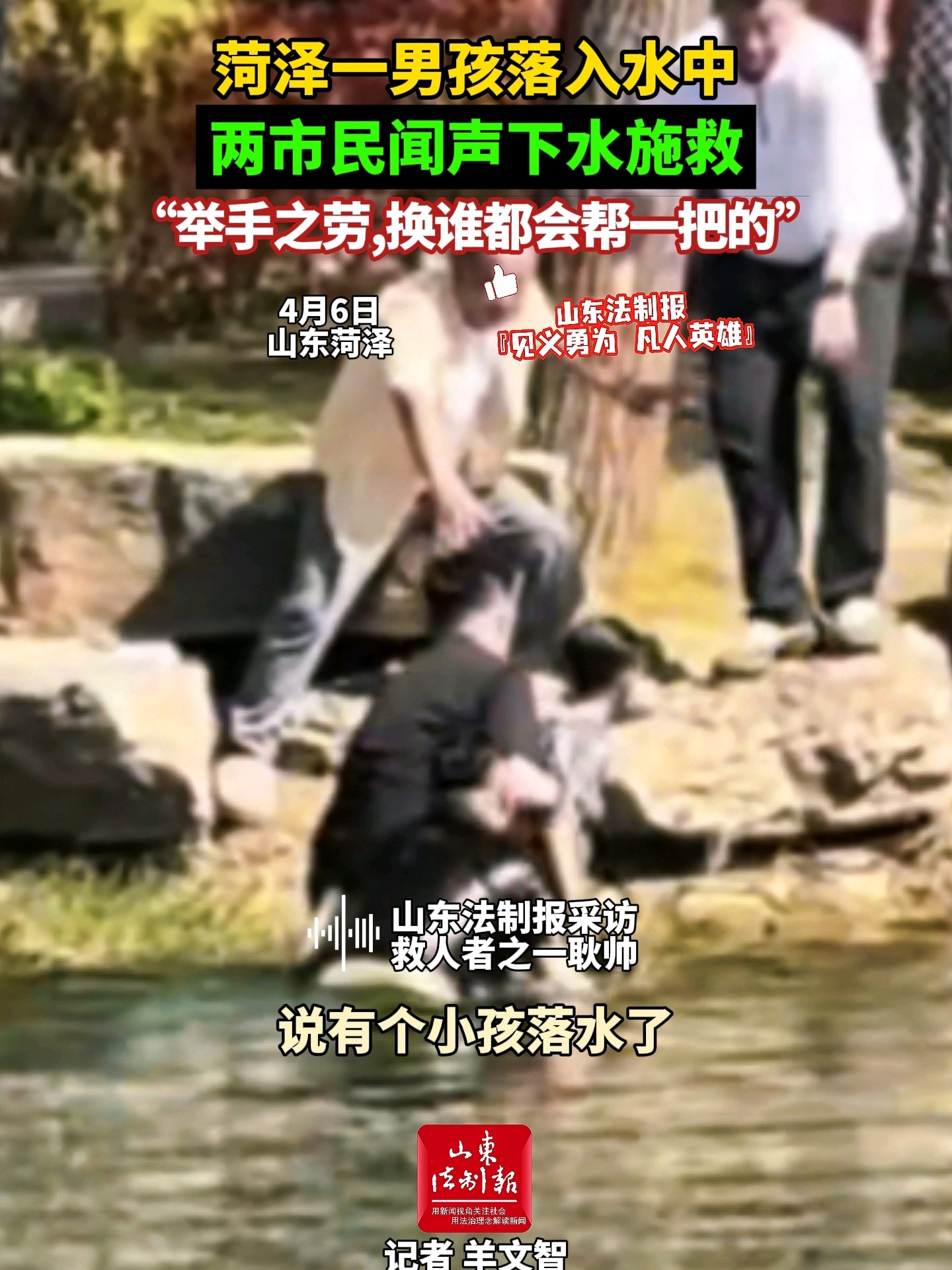菏泽一男孩落入水中,两市民闻声下水施救,“举手之劳,换谁都会帮一把的”山东法制报 | 15:59 现场山东法制报 微信扫码扫码下载客户端4月6日下午,菏泽牡丹区一名7岁男孩不慎落水。在岸边露营的市民耿帅、刘培迪听到呼救声后,立即冲上前下水施救,最终合力将男孩递交给岸边其他市民。他在接受本报记者采访时表示:“举手之劳,换谁都会帮一把的。”(大众新闻·山东法制报记者 羊文智)