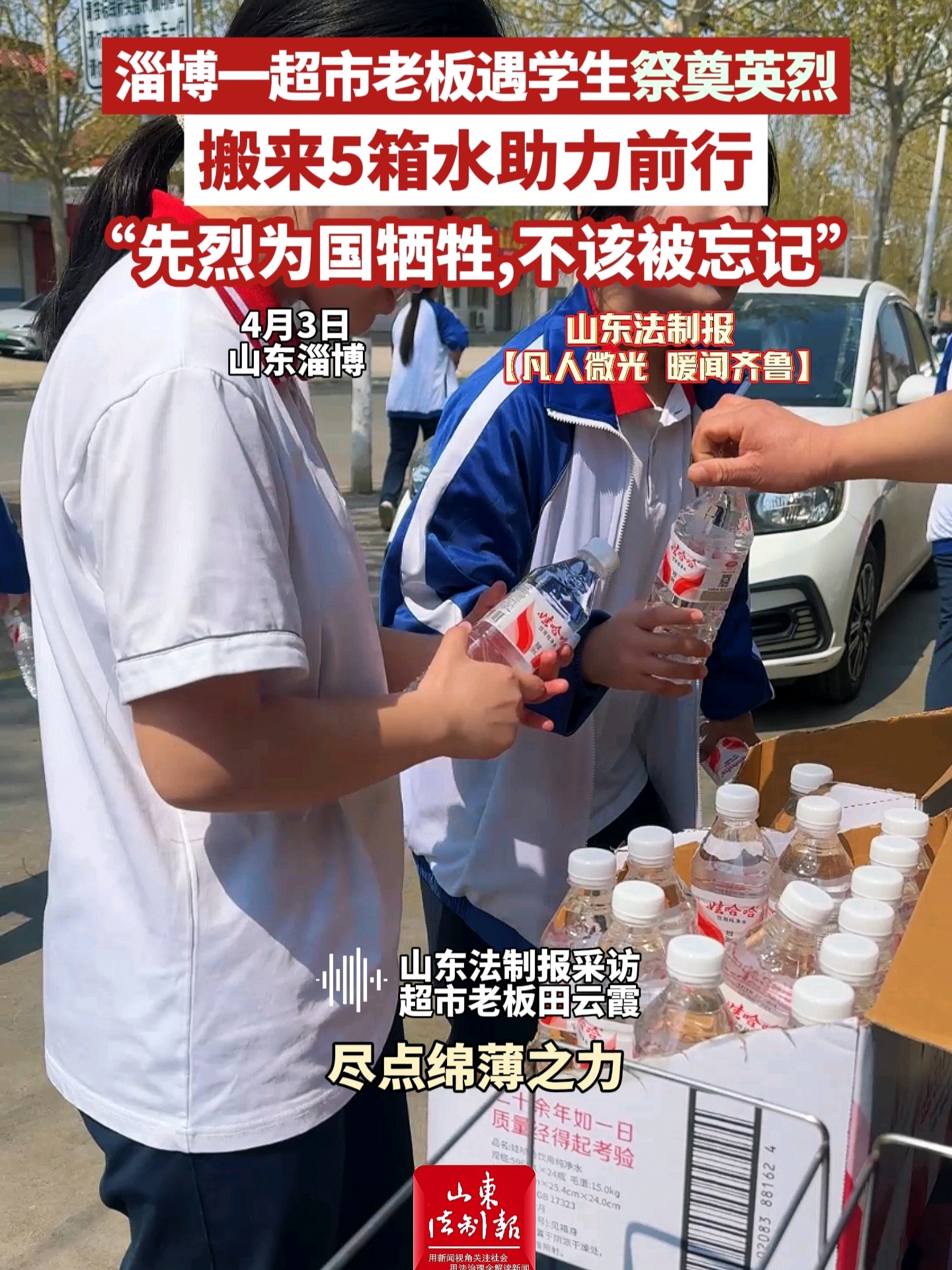 淄博一超市老板遇学生祭奠英烈,搬来5箱水助力前行,“先烈为国牺牲,不该被忘记”山东法制报 | 00:06 原创山东法制报 微信扫码扫码下载客户端4月3日,淄博张店,超市老板田云霞看到一群前往祭奠英烈的学生又渴又累,便搬来5箱矿泉水免费送给学生,想为孩子们祭奠先烈的路上尽一份力。田云霞说:“先烈为国牺牲,不该被忘记。”(大众新闻·山东法制报记者 羊文智)
