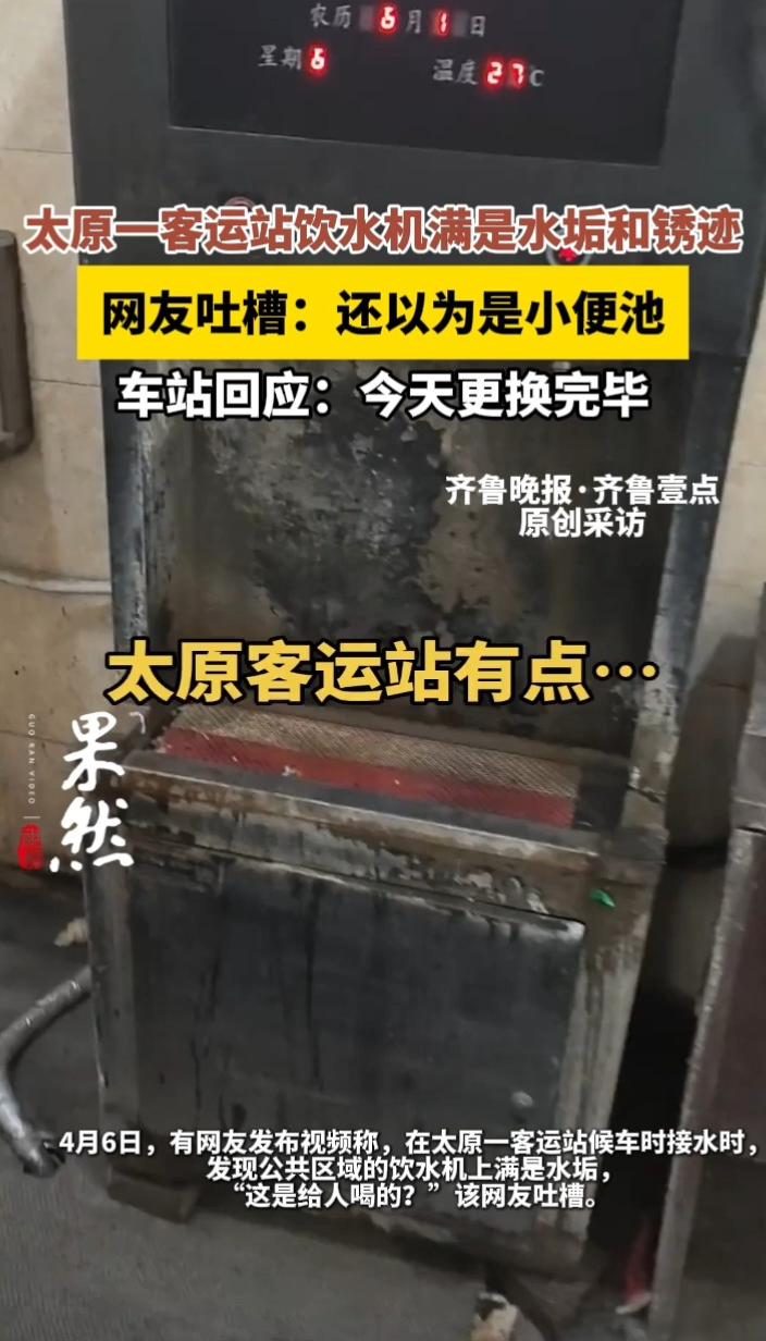 果然视频|太原一客运站饮水机满是水垢和锈迹,车站回应:今天更换完毕齐鲁壹点 | 16:33 原创齐鲁晚报·齐鲁壹点客户端 微信扫码扫码下载客户端4月6日,有网友发布视频称,在太原一客运站候车时接水时,发现公共区域的饮水机上满是水垢,“这是给人喝的?”该网友吐槽。 (齐鲁晚报·齐鲁壹点记者 崔可腾 袁野)
