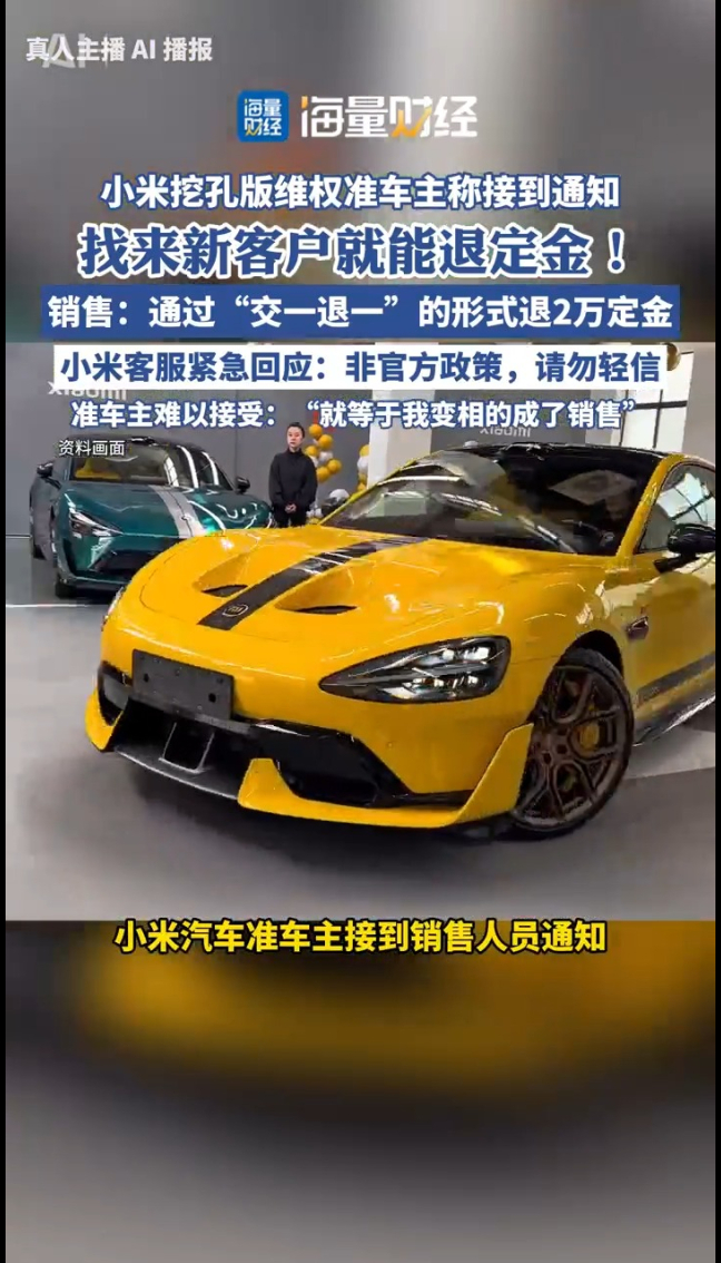 海量财经丨小米挖孔版维权准车主称接到通知,可找人买新车退回2万定金,客服:非车企政策