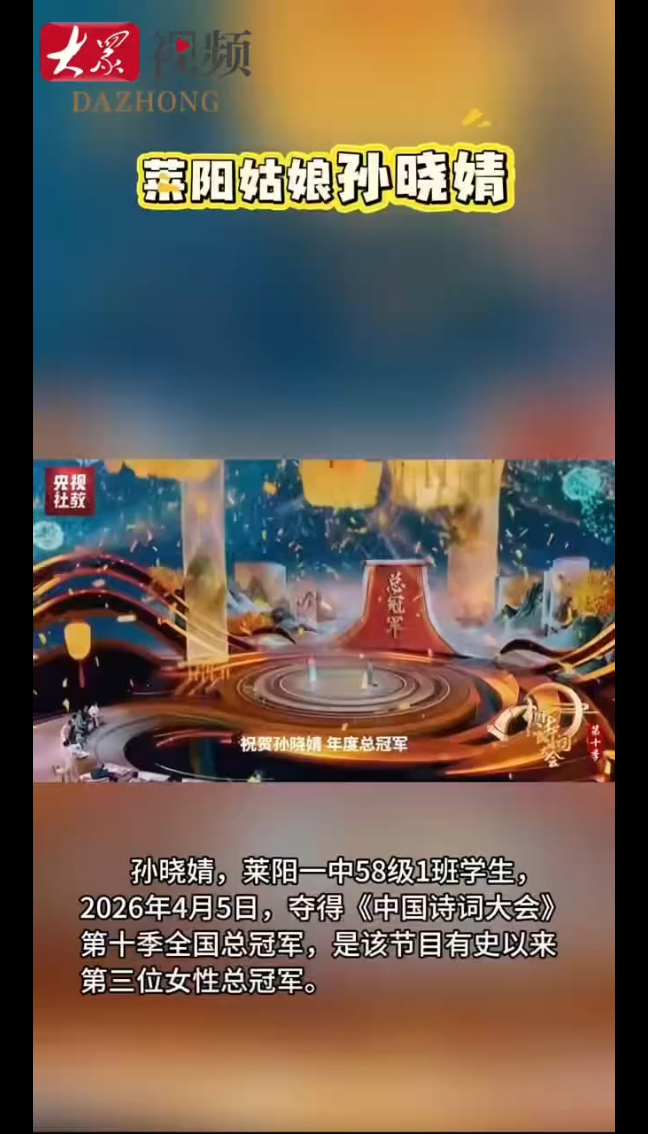 山东莱阳姑娘孙晓婧夺得《中国诗词大会》第十季总冠军 11:02 原创大众新闻 微信扫码扫码下载客户端孙晓婧,莱阳一中58级1班学生。2026年4月5日,夺得《中国诗词大会》第十季全国总冠军,是该节目有史以来第三位女性总冠军。(大众新闻记者 杨秀萍)