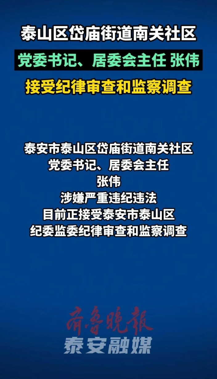 泰安市泰山区岱庙街道南关社区党委书记、居委会主任张伟接受纪律审查和监察调查大众报业·齐鲁壹点 10:15泰安市泰山区岱庙街道南关社区党委书记、居委会主任张伟涉嫌严重违纪违法,目前正接受泰安市泰山区纪委监委纪律审查和监察调查。