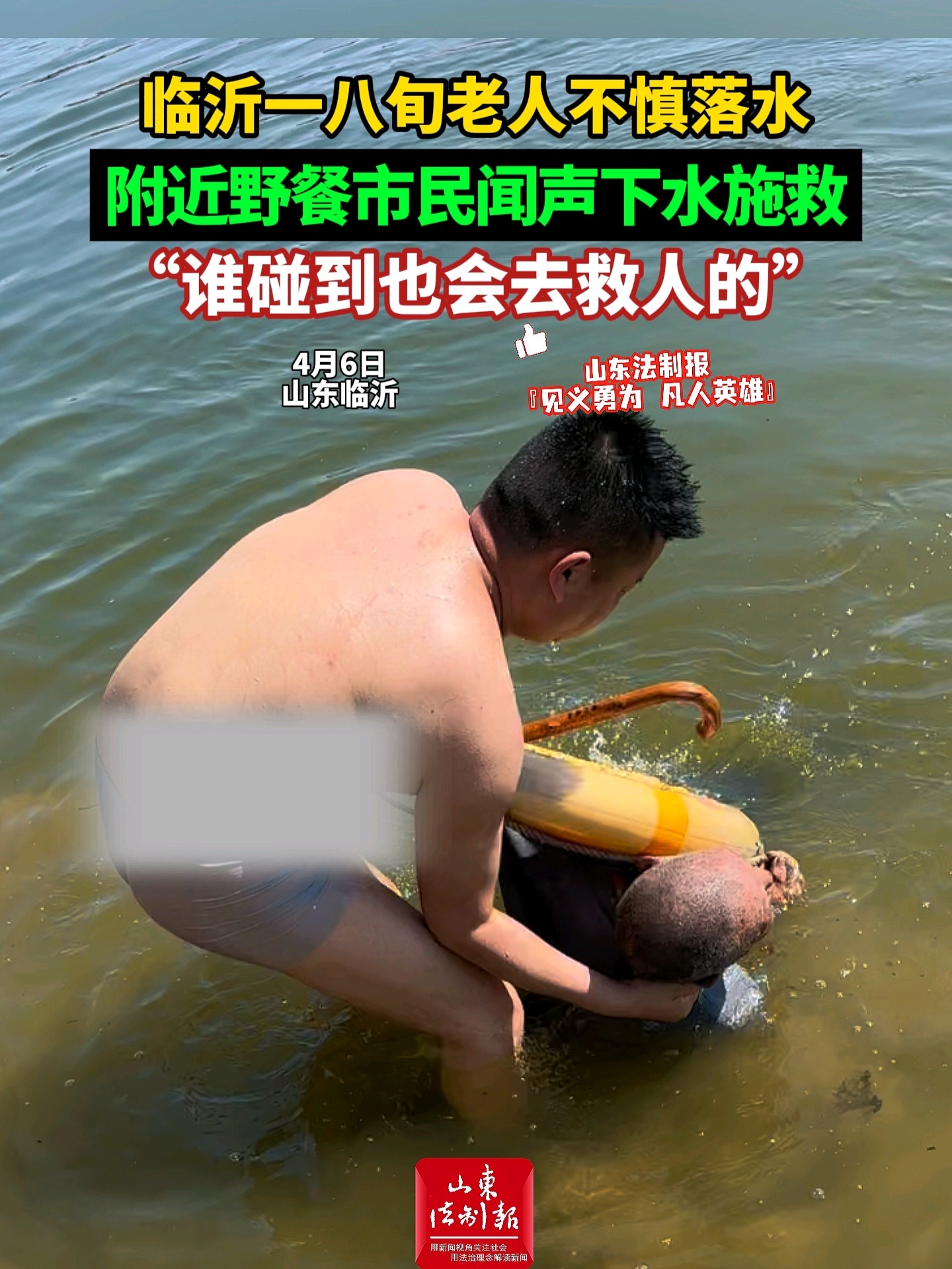 临沂八旬老人不慎落水,附近野餐市民闻声下水施救,“谁碰到也会去救人的” 17:23 现场山东法制报 微信扫码扫码下载客户端4月6日,临沂沂水,一位八旬老人不慎落水。附近野餐市民王洪鑫听到求救声后,快速跑到岸边,向老人投递救生圈未果,随即果断下水施救。随后,他与市民庞梦杰一同为老人紧急开展心肺复苏,后续老人被赶来的救护车送医救治。因施救及时,目前老人已脱离生命危险。王洪鑫在接受本报记者采访时表示:“这种事情,谁碰到也会去救人的。”(大众新闻·山东法制报记者 羊文智)