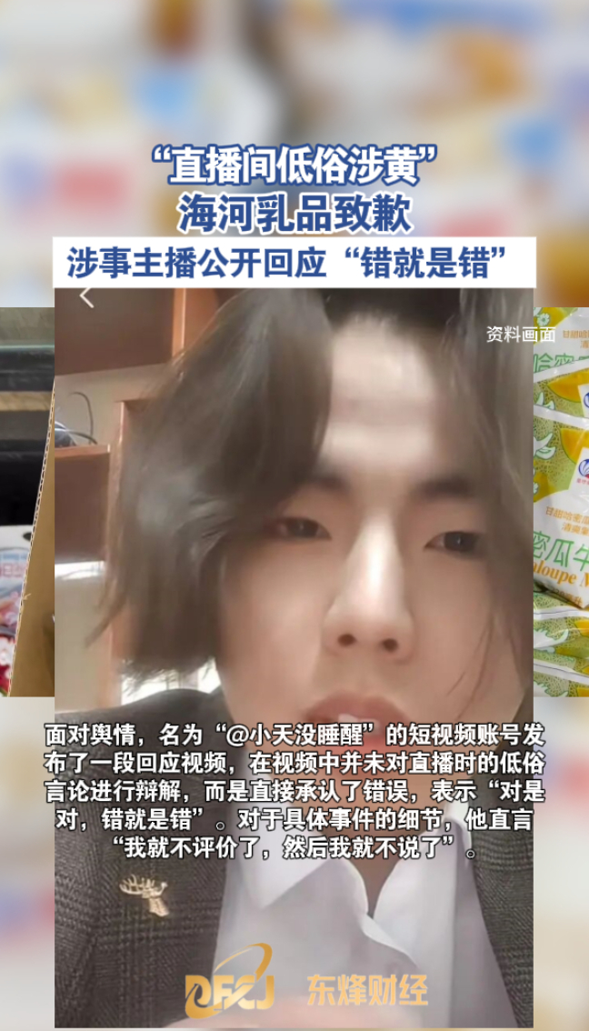 东烽财经丨“直播间低俗涉黄”海河乳品致歉,涉事主播公开回应“错就是错” 15:18 原创大众新闻 微信扫码扫码下载客户端4月8日,针对直播间主播带货时言论低俗涉黄,天津海河乳品有限公司发布致歉声明称,公司关注到“海河牛奶旗舰店”直播间相关视频内容给消费者带来不良影响,并引发舆论热议,公司深感自责并致以诚挚歉意。(大众新闻记者 姚会英)
