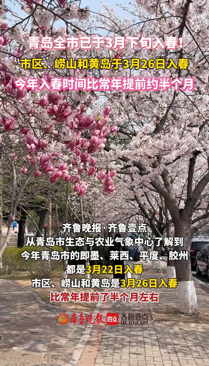 果然视频|比常年提前约半个月!青岛全市已于3月下旬入春齐鲁晚报·齐鲁壹点客户端 12:33原创最近一段时间,天气晴朗舒适,青岛是否已达到气象学入春的标准了呢?4月7日,齐鲁晚报·齐鲁壹点从青岛市生态与农业气象中心了解到,今年青岛市的即墨、莱西、平度、胶州都是3月22日入春,市区、崂山和黄岛是3月26日入春,比常年提前了半个月左右。入春提前的主要原因为,春季以来,我国北方大部地区的冷空气较弱,青岛气温偏高,进入春天的脚步也就快了许多。 (齐鲁晚报·齐鲁壹点 高雅洁)