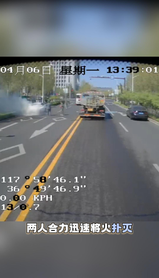 俺们淄博丨外地车自燃,两位司机冲上去的样子真帅 13:59 原创大众新闻·鲁中晨报 微信扫码扫码下载客户端4月6日下午,在淄博主城区心环西路一路口附近,一辆外地牌照轿车突然自燃!危急时刻,一位洒水车司机和一位公交车司机冲了上去,合力将火扑灭。(大众新闻·鲁中晨报记者 伊巍 孙渤海)