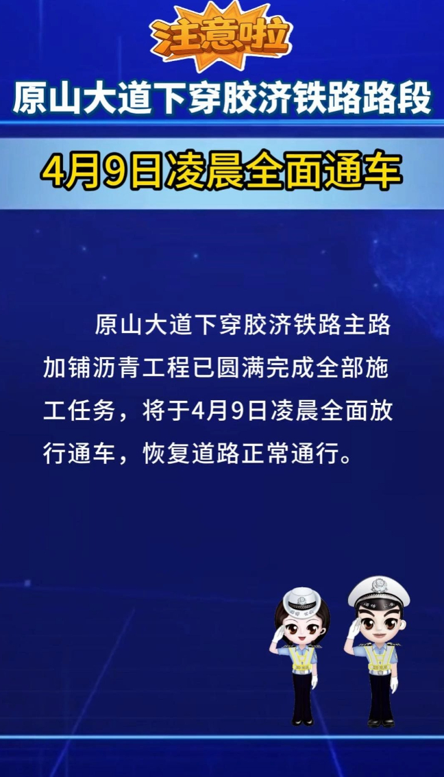 原山大道下穿胶济铁路路段 4月9日凌晨全面通车鲁中晨报 | 04-08 原创大众新闻·鲁中晨报 微信扫码扫码下载客户端4月8日,淄博交警发布消息,原山大道下穿胶济铁路加铺沥青工程已圆满完成全部施工任务,将于4月9日凌晨全面放行通车,恢复道路正常通行。(大众新闻·鲁中晨报 记者 任灵芝 通讯员 张轶)