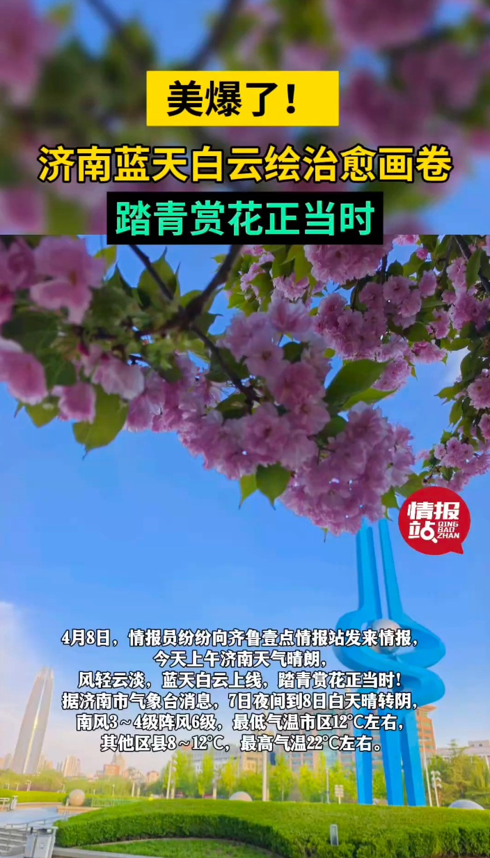 天气情报站|美爆了!济南蓝天白云绘治愈画卷,踏青赏花正当时 13:00 大众报业·齐鲁壹点 微信扫码扫码下载客户端4月8日,情报员纷纷向齐鲁壹点情报站发来情报,今天上午济南天气晴朗,风轻云淡,蓝天白云上线,踏青赏花正当时!据济南市气象台消息,7日夜间到8日白天晴转阴,南风3~4级阵风6级,最低气温市区12℃左右,其他区县8~12℃,最高气温22℃左右。