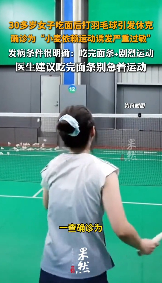 30多岁女子吃面后打羽毛球引发休克,确诊为“小麦依赖运动诱发严重过敏”。