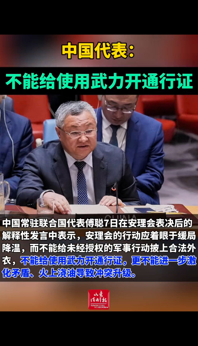 中国代表:不能给使用武力开通行证 18:10 现场央视新闻 微信扫码扫码下载客户端中国常驻联合国代表傅聪7日在安理会表决后的解释性发言中表示,安理会的行动应着眼于缓局降温,而不能给未经授权的军事行动披上合法外衣,不能给使用武力开通行证,更不能进一步激化矛盾、火上浇油导致冲突升级。联合国安理会当天就一项涉及霍尔木兹海峡的决议草案进行表决,11票赞成,巴基斯坦和哥伦比亚弃权,作为常任理事国的中国和俄罗斯投反对票,决议草案未获通过。
