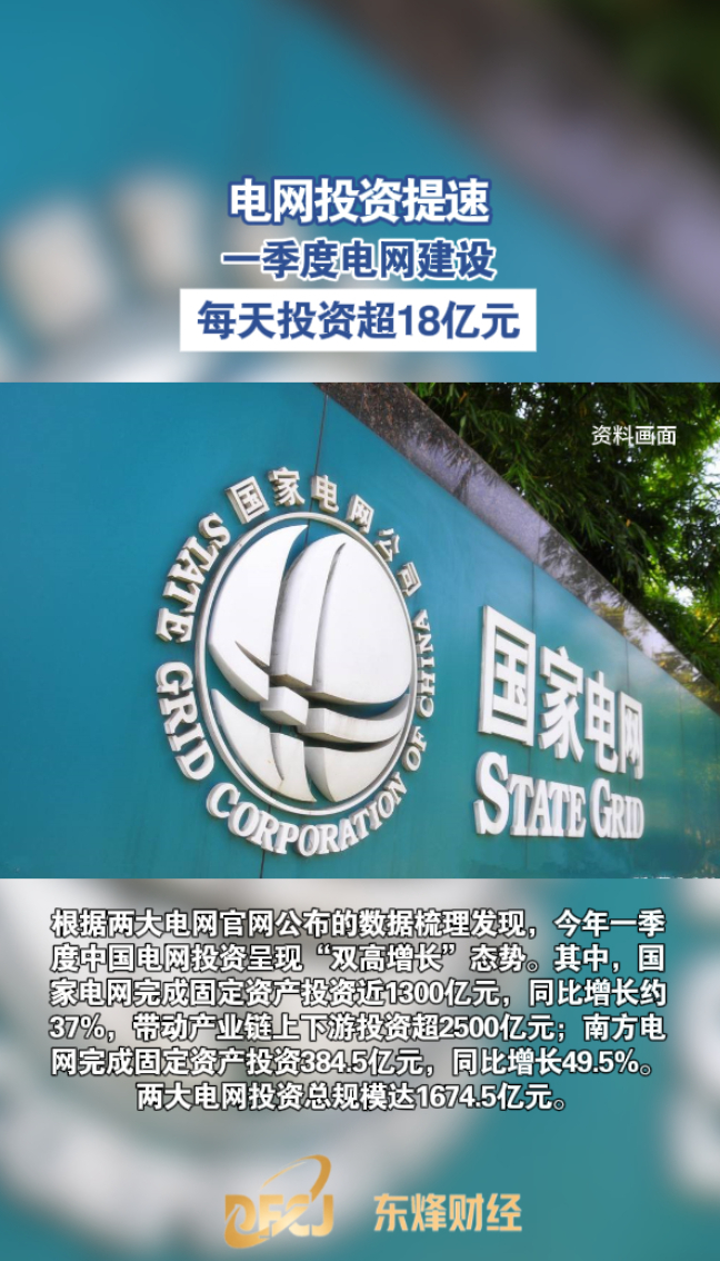 东烽财经丨电网投资提速,一季度电网建设每天投资超18亿元 18:14 原创大众新闻 微信扫码扫码下载客户端根据两大电网官网公布的数据梳理发现,今年一季度中国电网投资呈现“双高增长”态势。其中,国家电网完成固定资产投资近1300亿元,同比增长约37%,带动产业链上下游投资超2500亿元;南方电网完成固定资产投资384.5亿元,同比增长49.5%。两大电网投资总规模达1674.5亿元。(大众新闻记者 姚会英)