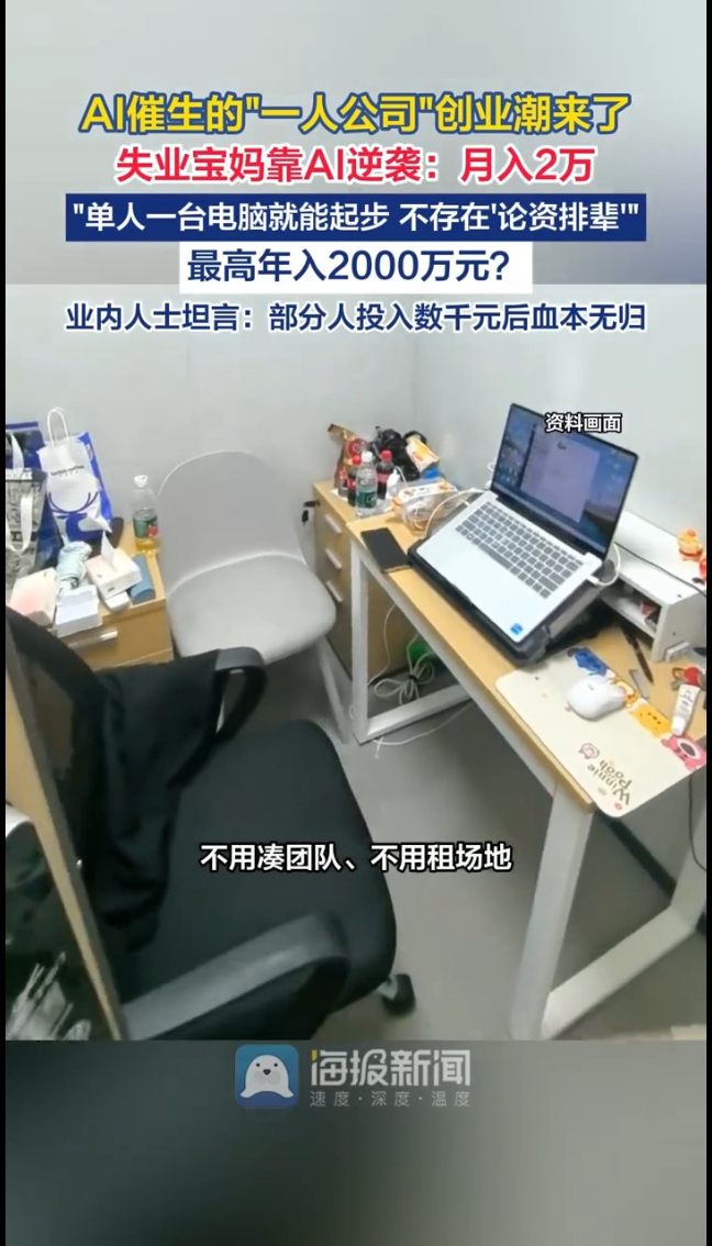 主播说丨AI催生的“一人公司”创业潮来了,失业宝妈靠AI逆袭:月入2万,业内人士坦言:部分人投入数千元后血本无归