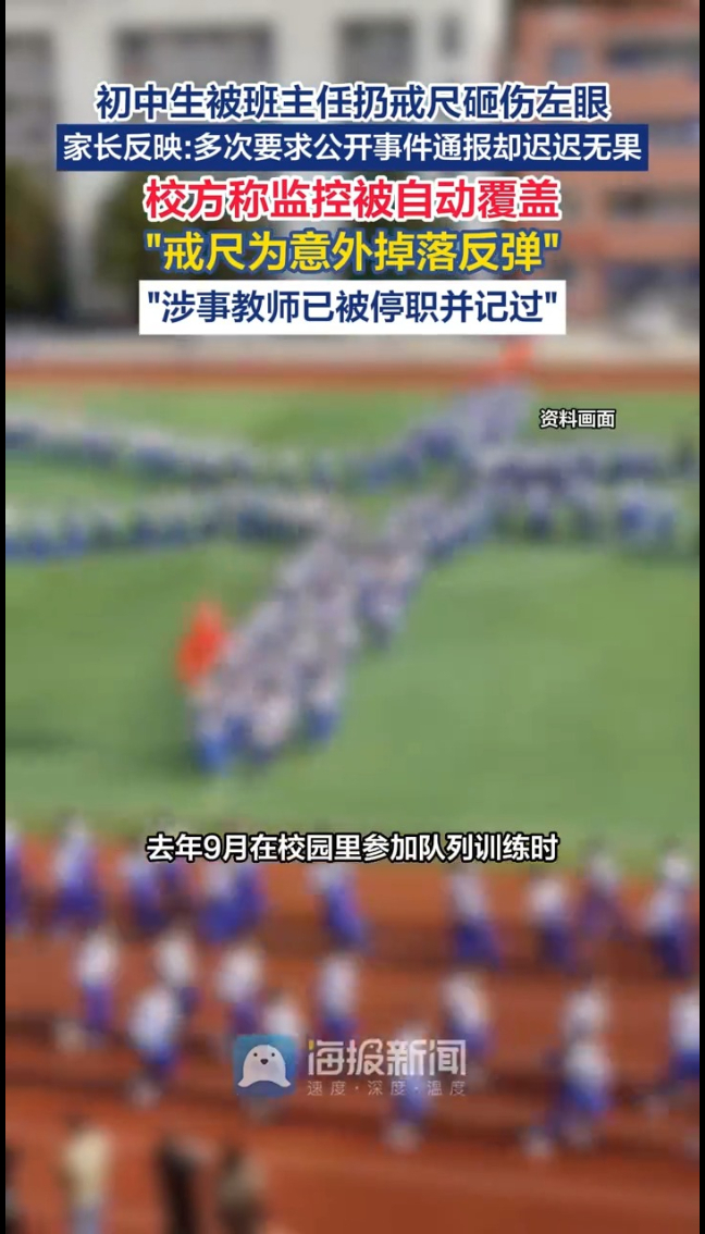 初中生被班主任扔戒尺砸伤左眼,校方称监控被自动覆盖,戒尺为意外掉落反弹。
