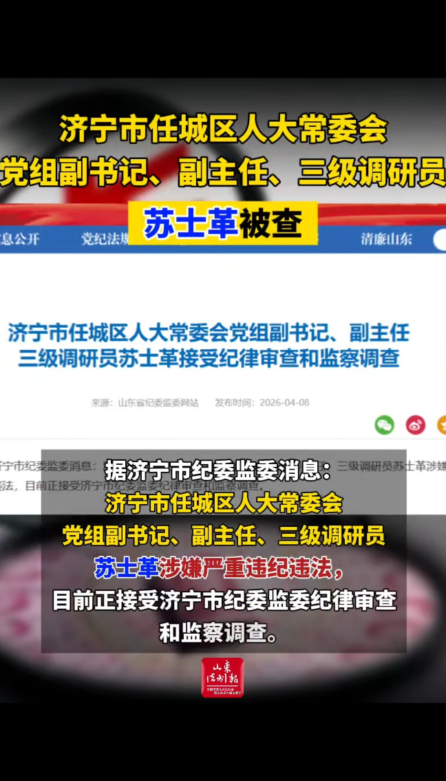 济宁市任城区人大常委会党组副书记、副主任、三级调研员苏士革被查 18:56 现场山东省纪委监委网站 微信扫码扫码下载客户端据济宁市纪委监委消息:济宁市任城区人大常委会党组副书记、副主任、三级调研员苏士革涉嫌严重违纪违法,目前正接受济宁市纪委监委纪律审查和监察调查。#打虎拍蝇 #济宁 #审查调查 #反腐