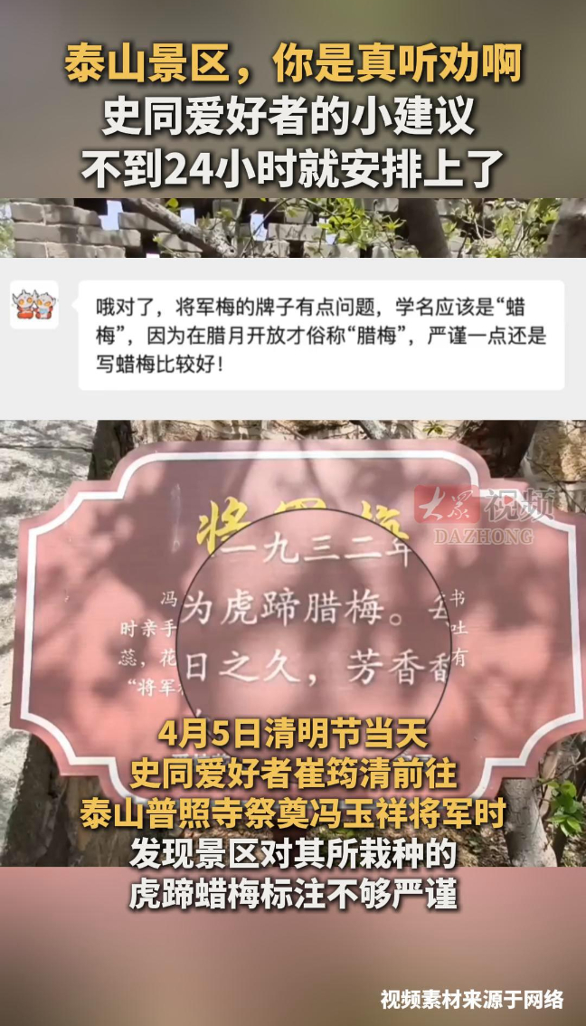 4月5日清明节当天,史同爱好者崔筠清前往泰山普照寺祭奠冯玉祥将军时,发现景区对其所栽种的虎蹄蜡梅标注不够严谨。随后,她通过泰安市人民政府的政民互动板块线上提交了建议。4月6日下午,不到24小时,她就收到了景区工作人员来电。对方表示:已向上级汇报,会增加一块标注“将军梅”学名的牌子。