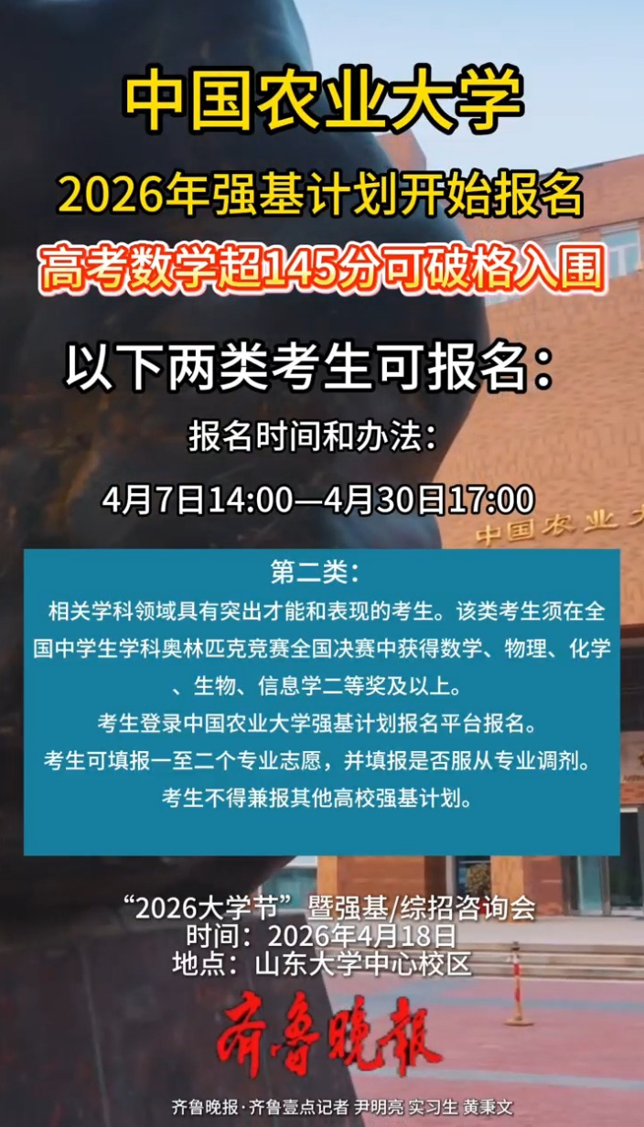 果然视频|中国农业大学2026年强基计划开始报名了 17:29 原创齐鲁晚报·齐鲁壹点客户端 微信扫码扫码下载客户端中国农业大学2026年强基计划开始报名了,4月7日至30日,考生可登录中国农业大学强基计划报名平台报名。根据要求,考生可填报一至二个专业志愿,并填报是否服从专业调剂,不得兼报其他高校强基计划。 (齐鲁晚报·齐鲁壹点记者 尹明亮 实习生 黄秉文)