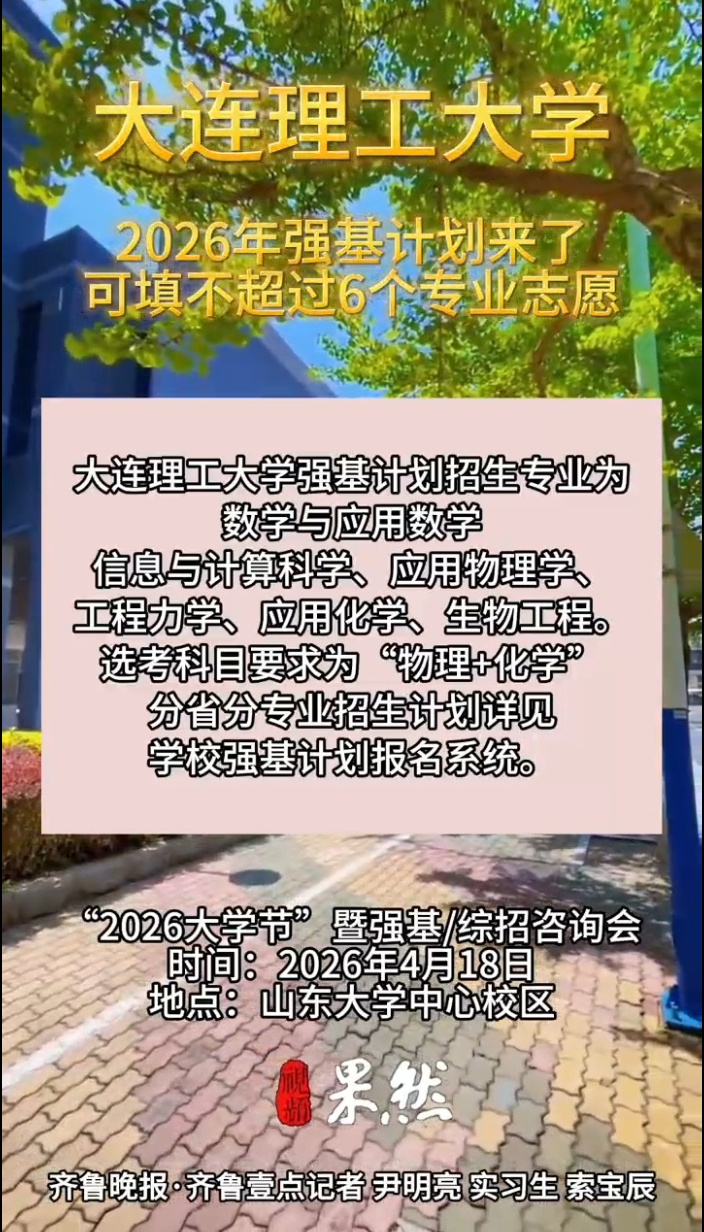 果然视频|大连理工大学2026年强基计划来了,可报6个专业 17:28 原创齐鲁晚报·齐鲁壹点客户端 微信扫码扫码下载客户端大连理工大学2026年强基计划来了,即日起至4月30日考生可登录大连理工大学强基计划报名平台网上报名。大连理工大学强基计划招生专业为数学与应用数学、信息与计算科学、应用物理学、工程力学、应用化学、生物工程。考生报考时可填选不超过6个专业志愿,并可填选是否服从专业调剂。 (齐鲁晚报·齐鲁壹点记者 尹明亮 实习生 索宝辰)
