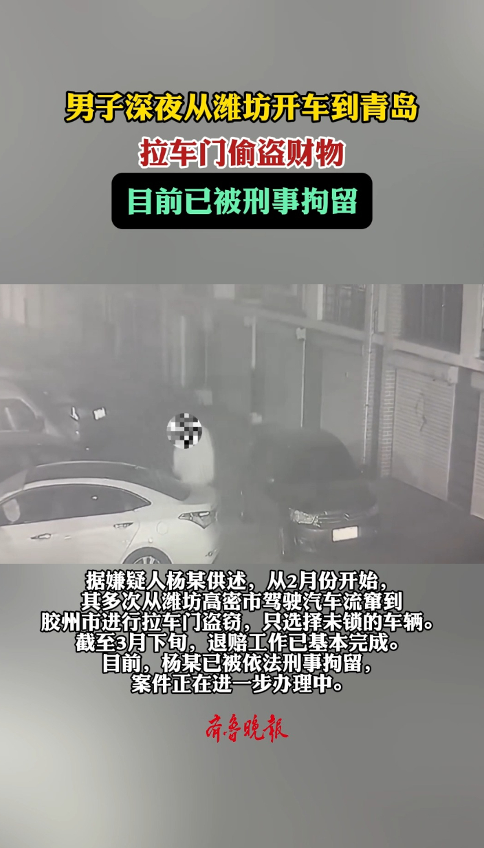 果然视频丨从潍坊开车到青岛专为拉车门!男子已被刑事拘留齐鲁晚报·齐鲁壹点客户端 18:50原创日前,胶州市公安局破获系列拉车门盗窃案件,从潍坊高密市抓获1名嫌疑人,及时为市民追回损失1万余元。据嫌疑人杨某供述,从2月份开始,其多次从潍坊高密市驾驶汽车流窜到胶州市进行拉车门盗窃,只选择未锁的车辆。截至3月下旬,退赔工作已基本完成。目前,杨某已被依法刑事拘留,案件正在进一步办理中。 (齐鲁晚报·齐鲁壹点 刘震 通讯员 孙艺涵 马君伟)