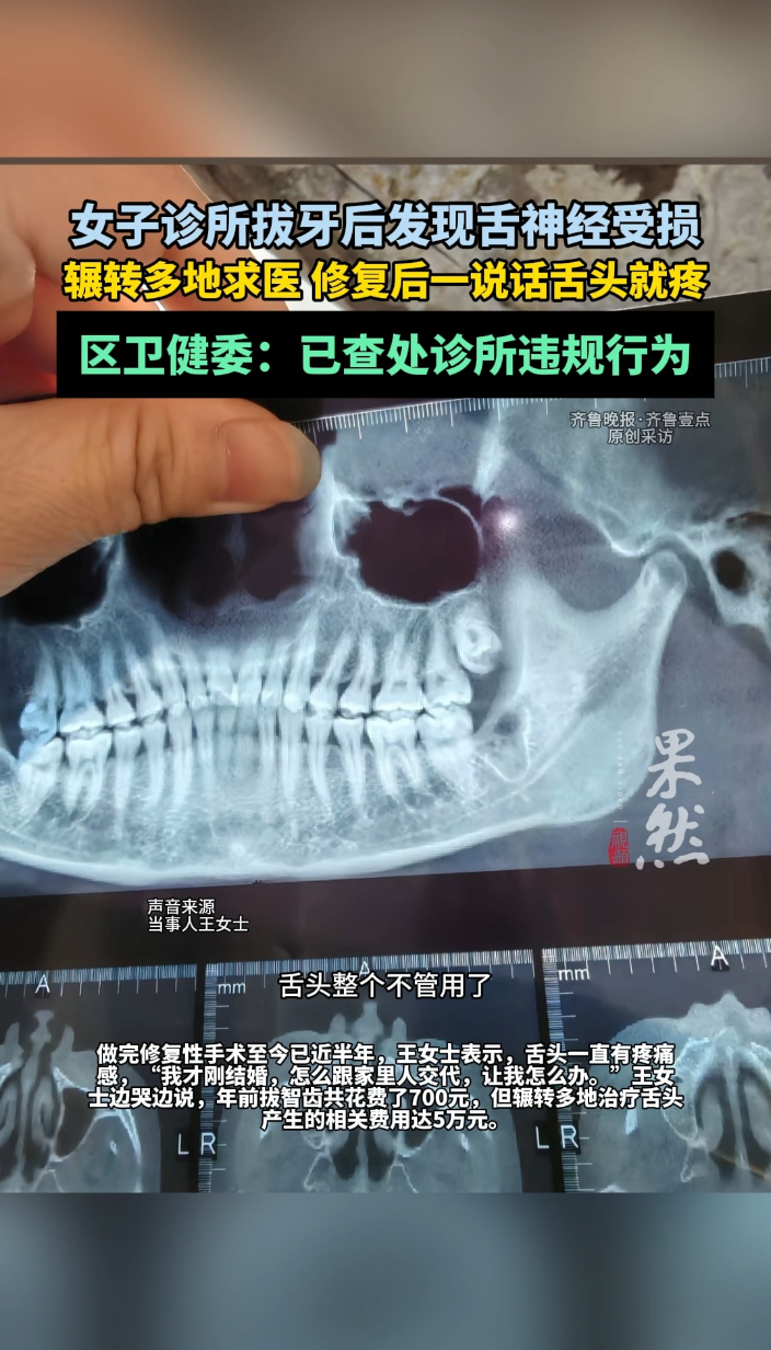 果然视频|女子诊所拔牙后舌头失去知觉,竟是左舌神经受损,区卫健委回应 18:57 原创齐鲁晚报·齐鲁壹点客户端 微信扫码扫码下载客户端4月8日,焦作市民王女士向齐鲁晚报·齐鲁壹点记者反映,自己在当地一家口腔诊所拔完智齿几天后,伤口剧痛,舌头也毫无知觉,最后北京大学口腔医院出具的诊断证明显示“左舌神经损伤”。“拔个牙怎么还能成这样,舌头像一团死肉一样,毫无知觉!”王女士情绪激动地说。(齐鲁晚报·齐鲁壹点记者 崔可腾)