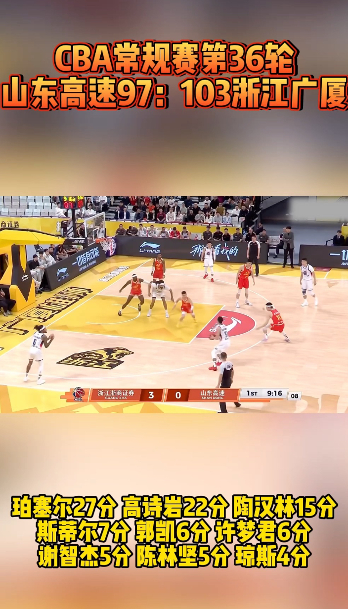 果然视频|山东高速97:103不敌浙江广厦,珀塞尔空砍27分齐鲁壹点 | 昨天22:21 原创齐鲁晚报·齐鲁壹点客户端 微信扫码扫码下载客户端4月8日晚,CBA常规赛第36轮,山东高速男篮客场97:103不敌卫冕冠军浙江广厦。珀塞尔空砍27分,塔克拿到三双。(齐鲁晚报·齐鲁壹点 冯子涵)