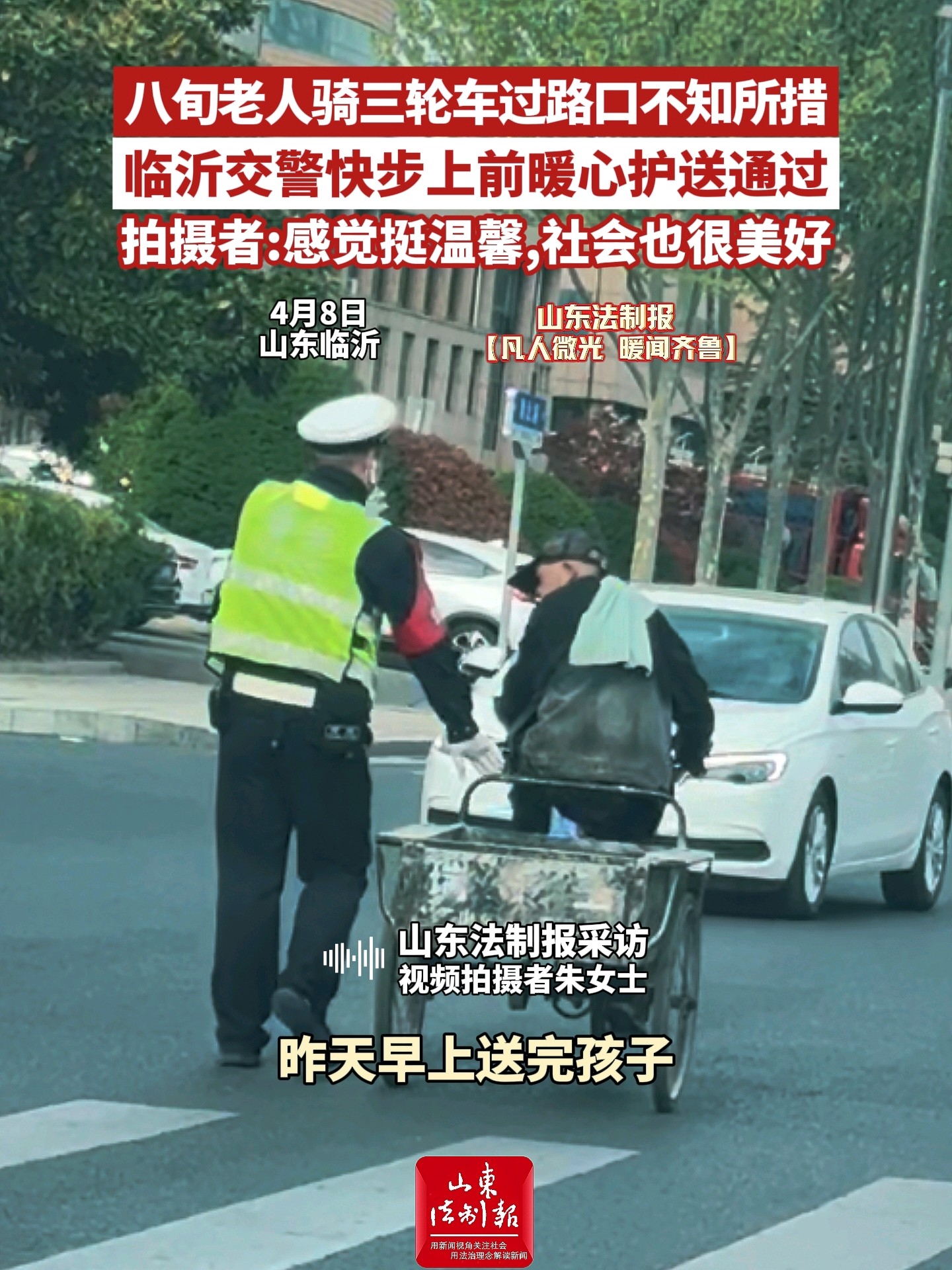 八旬老人骑三轮车过路口不知所措,临沂交警快步上前暖心护送通过,拍摄者:感觉挺温馨,社会也很美好 19:46 现场山东法制报 微信扫码扫码下载客户端4月8日,临沂罗庄一位骑三轮车的八旬老人在过路口时,因不熟悉交通规则显得手足无措。执勤交警第一时间上前,暖心护送老人安全通过路口。这一幕被市民朱女士用手机拍下,她直呼画面很温馨,让人觉得社会很美好。(大众新闻·山东法制报记者 羊文智)