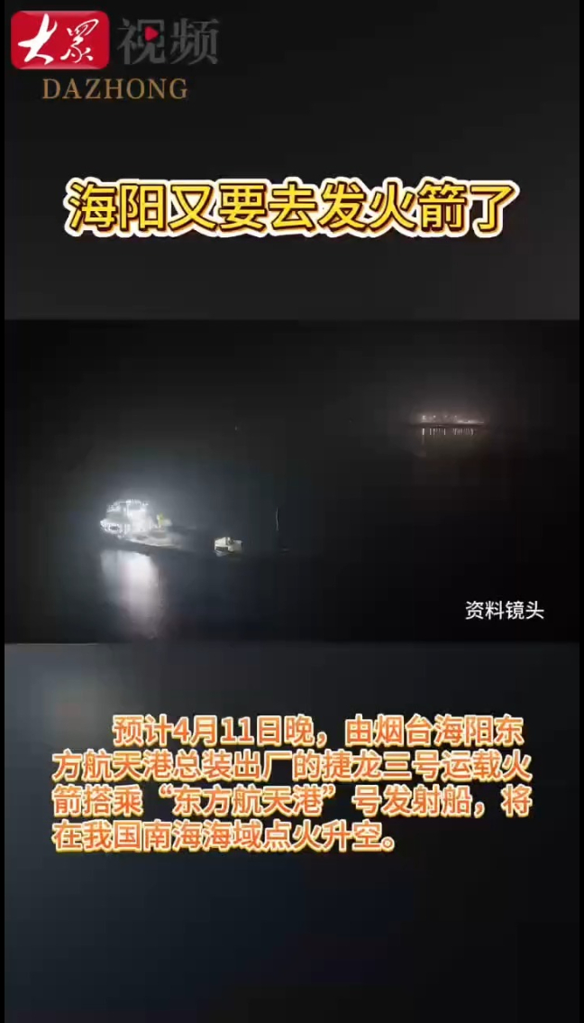 海阳又要去发火箭了! 11:41 原创大众新闻 微信扫码扫码下载客户端记者从烟台海阳市委宣传部获悉,预计4月11日晚,由烟台海阳东方航天港总装出厂的捷龙三号运载火箭搭乘“东方航天港”号发射船,将在我国南海海域点火升空。 本次发射将是捷龙三号运载火箭的第11次发射,是捷龙系列运载火箭的第12次发射。(大众新闻记者 杨秀萍)