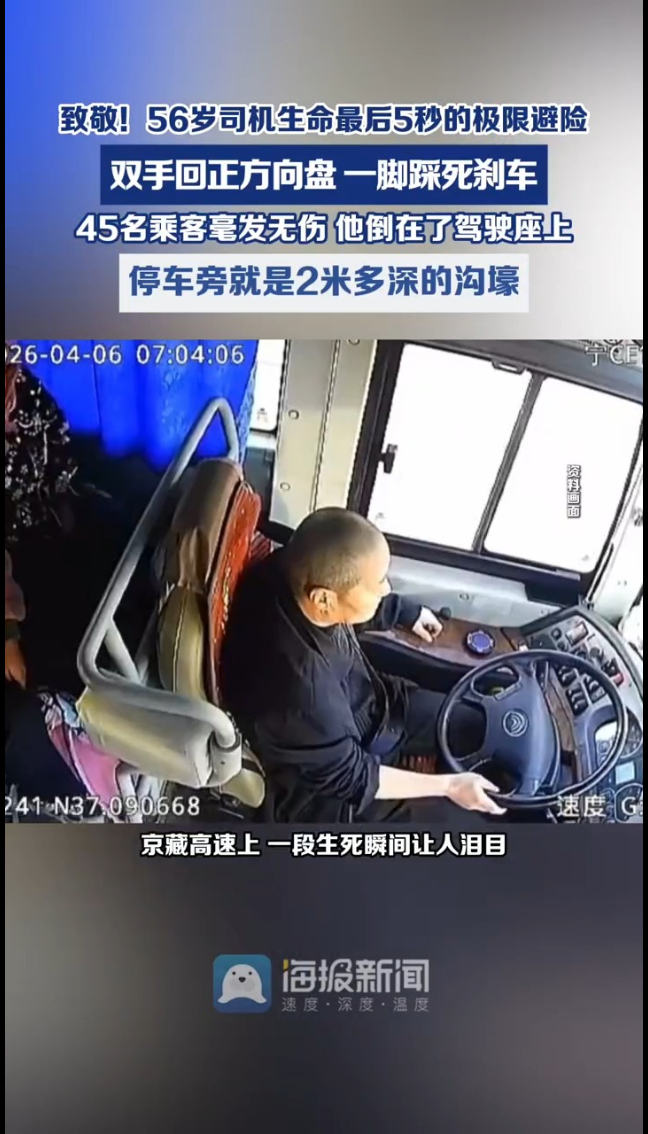 4月6日,京藏高速上,一段生死瞬间让人泪目。56岁的客车司机周岐红,拥有30年驾龄,在执行客运任务途中突发疾病,他用短短5秒完成极限避险操作,在生命最后时刻护住了车上45名乘客的安全。