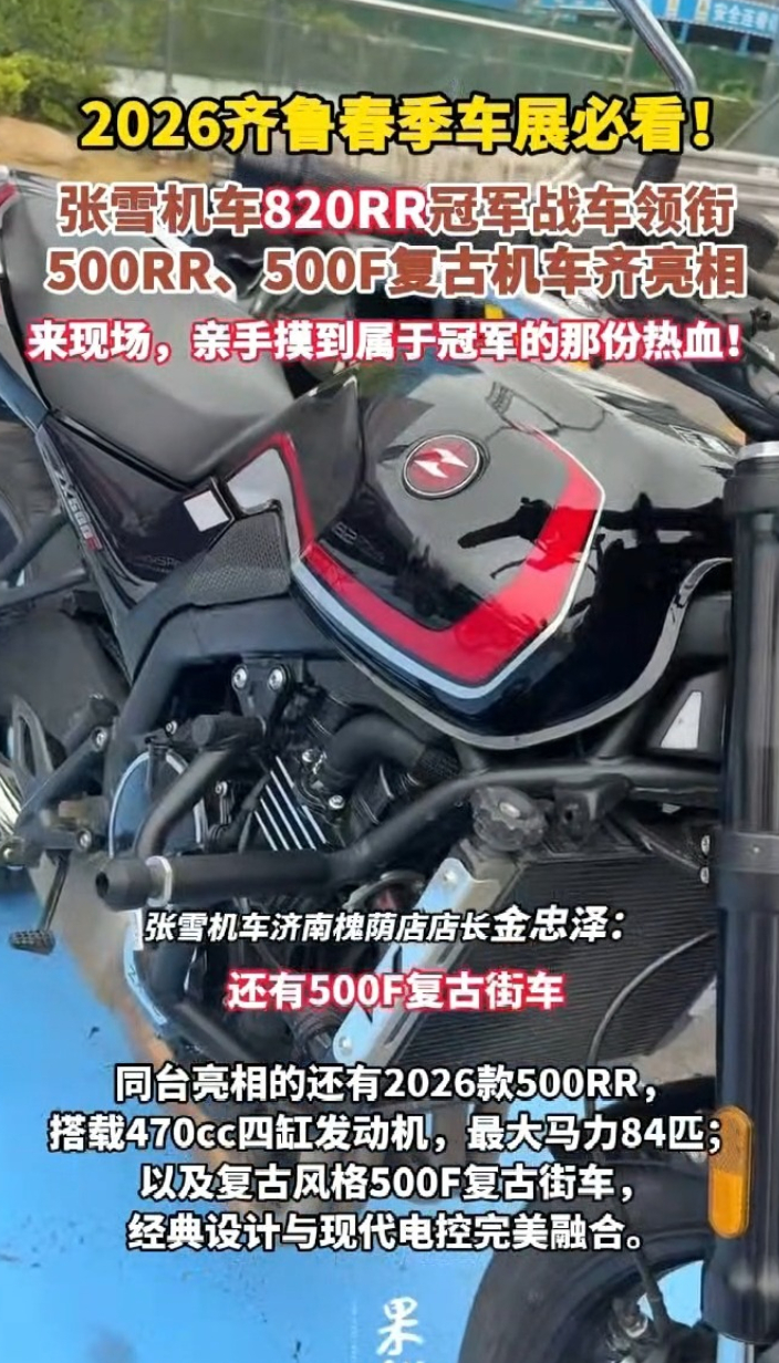 4月9日,2026 齐鲁春季车展(第五十三届齐鲁汽车展览交易会)在山东国际会展中心隆重举办。世界超级摩托车锦标赛冠军车型 ——张雪机车820RR亮相展会,展现国产高端摩托车实力,同台亮相的还有2026款500RR,搭载470cc四缸发动机,最大马力84匹,以及复古风格500F复古街车,经典设计与现代电控完美融合,为车友带来专业级体验。