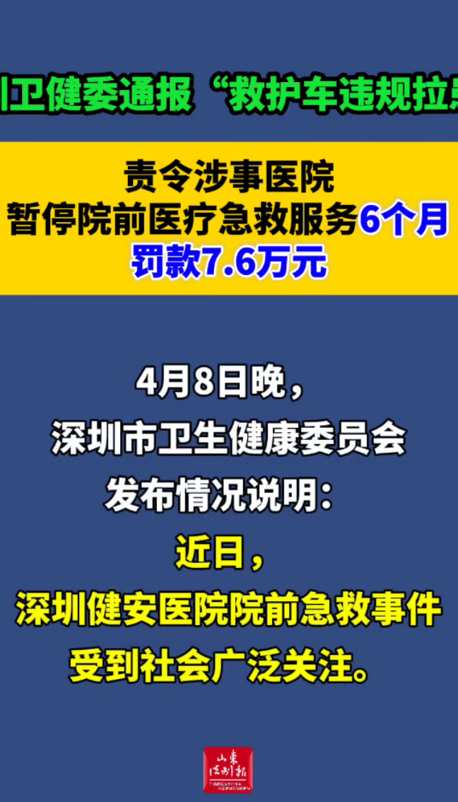 深圳卫健委通报“救护车违规拉患”:责令涉事医院暂停院前医疗急救服务6个月,罚款7.6万元