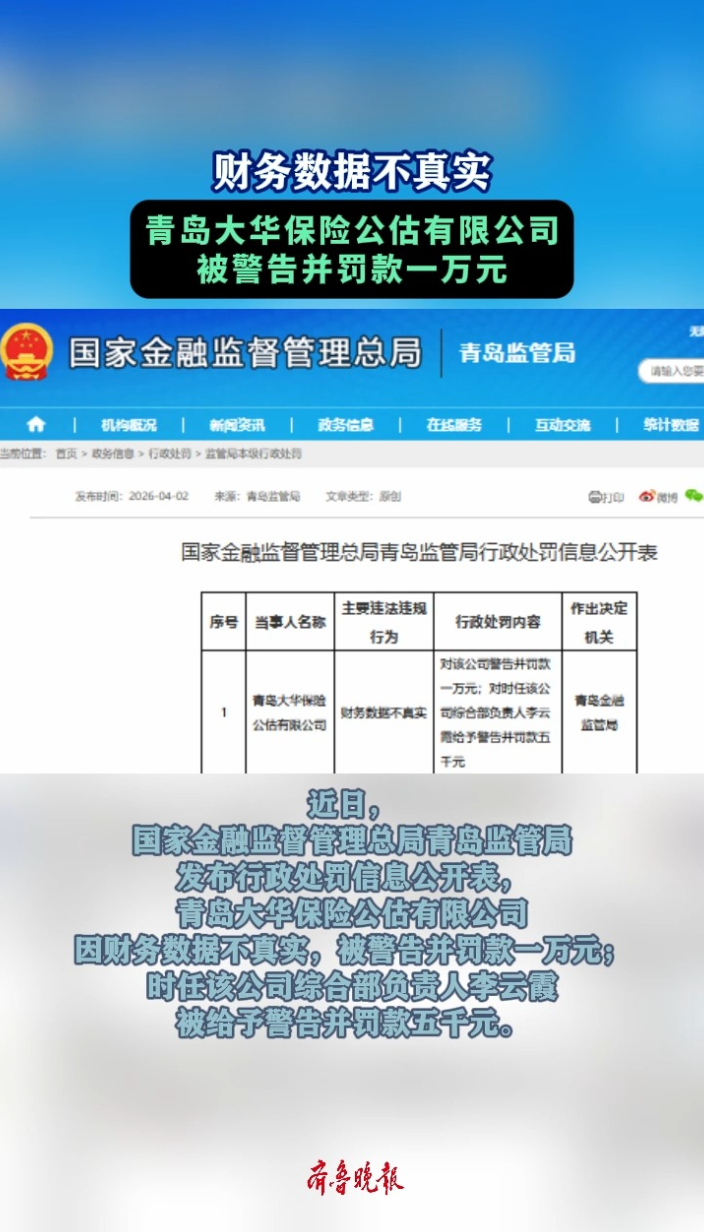 果然视频丨青岛大华保险公估有限公司被警告并罚款一万元齐鲁晚报·齐鲁壹点客户端 14:01原创近日,国家金融监督管理总局青岛监管局发布行政处罚信息公开表,青岛大华保险公估有限公司因财务数据不真实,被警告并罚款一万元;时任该公司综合部负责人李云霞被给予警告并罚款五千元。 (齐鲁晚报·齐鲁壹点记者 尚青龙)
