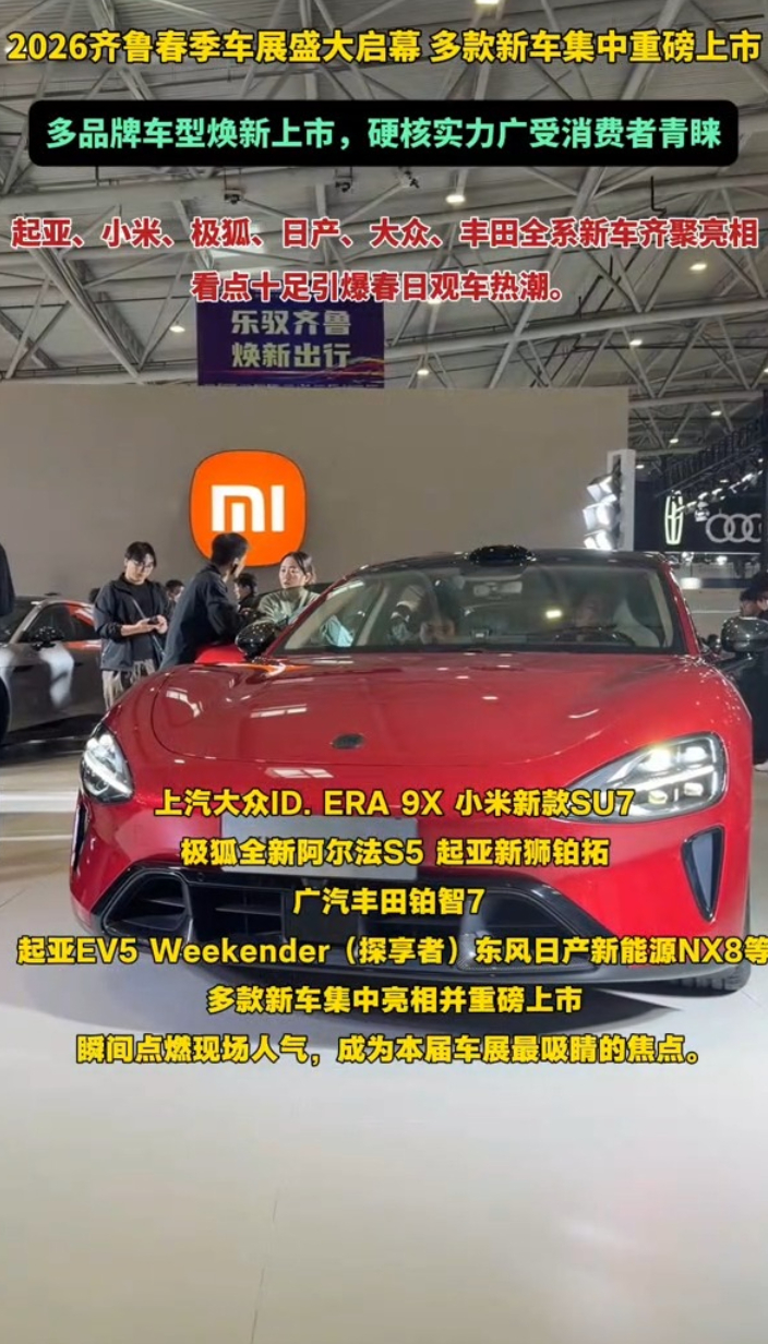 果然视频|2026齐鲁春季车展启幕,多款新车重磅上市 17:47 原创齐鲁晚报·齐鲁壹点客户端 微信扫码扫码下载客户端4月9日,2026齐鲁春季车展在山东国际会展中心正式开幕。作为山东开年首场大型车展,本届展会汇聚起亚EV5 Weekender(探享者)、小米新一代SU7、极狐全新阿尔法S5、起亚新狮铂拓界、东风日产新能源NX8、上汽大众ID. ERA 9X、广汽丰田铂智7等多款重磅新车集中亮相与上市,纯电与燃油车型同台焕新,引爆春日购车热潮。 齐鲁晚报·齐鲁壹点 王劲松