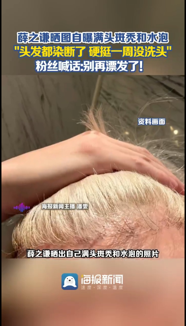 主播说丨薛之谦晒图自曝满头斑秃和水泡 “头发都染断了,硬挺一周没洗头” 17:55 原创大众新闻·海报新闻 微信扫码扫码下载客户端薛之谦晒出自己满头斑秃和水泡的照片,说:很痒的头,其实第一天演出前头发就染断了,满头斑秃和水泡,硬挺了一周没洗头。做完造型你看不出来,搞笑吧?粉丝看完心疼坏了:别再漂发了!头发都毁了。这已经不是第一个明星被漂发“毁头皮”了。之前黄子韬也自曝减肥过度导致斑秃,还劝大家别拿生姜乱抹。(海报新闻综合潮新闻·钱江晚报编辑黄晓荣 孙梦媛 潘雯 张光)