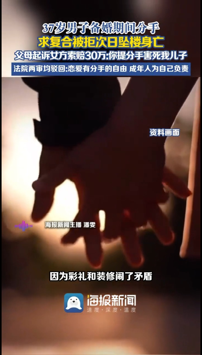 37岁男子,恋爱3个月准备结婚,因为彩礼和装修闹了矛盾,女友提了分手。他上门求复合被拒,第二天坠楼身亡。然后,男方父母把女方告了,索赔30万!
