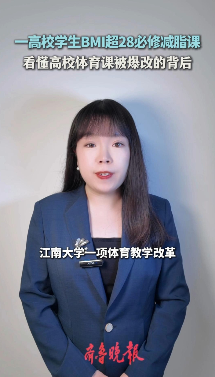 佳点观察|BMI超过28的肥胖学生必修“减脂课”,看懂大学爆改体育课的背后齐鲁晚报·齐鲁壹点客户端 18:15原创BMI指数超过28,就要必修减脂课。最近江南大学的一项体育教学改革,引发不少热议。(齐鲁晚报·齐鲁壹点记者 范佳)