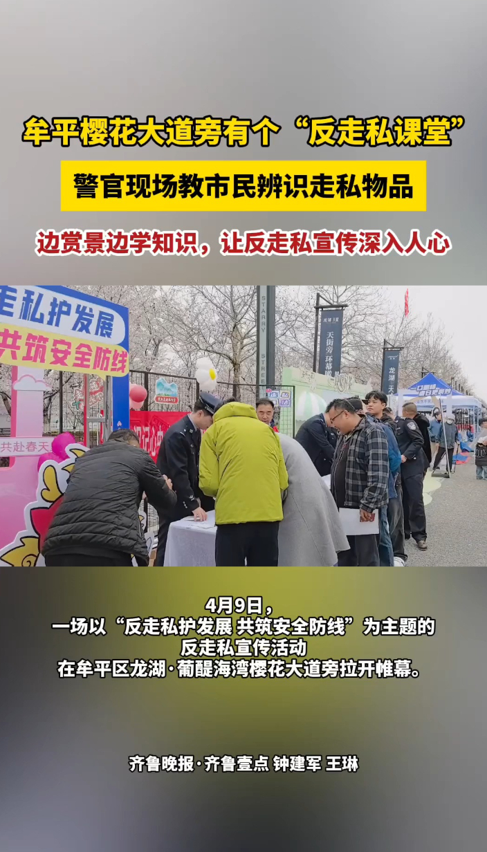 果然视频|牟平樱花大道旁设反走私课堂,警官教市民辨识走私物品齐鲁晚报·齐鲁壹点客户端 昨天21:36原创4月9日,烟台市在牟平区龙湖·葡醍海湾樱花大道旁开展了一场别开生面的反走私主题宣传活动。活动现场,警官现场教市民辨识走私物品,边赏景边学知识,让反走私宣传深入人心。 (齐鲁晚报·齐鲁壹点 钟建军 王琳)