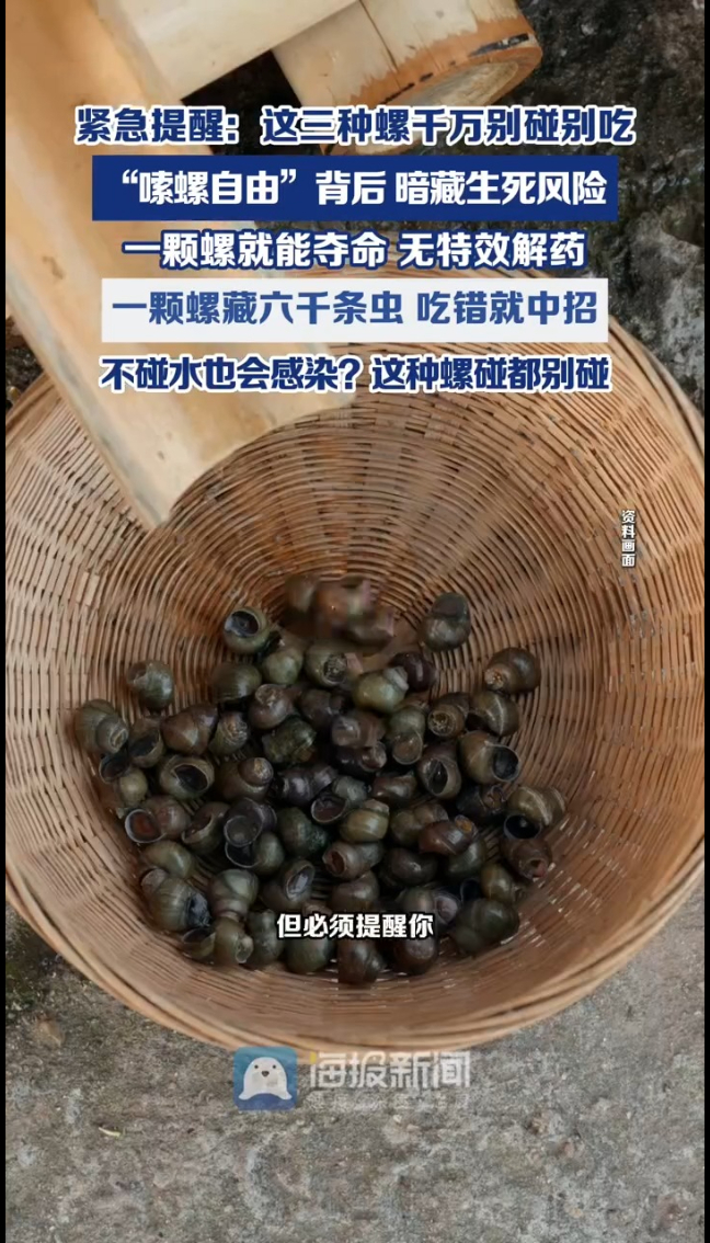 请记住:来源不明的不买,不确定的不吃,有钉螺的水不碰。健康没有侥幸,提醒您身边爱吃螺的家人!(海报新闻综合健康时报 编辑 冯浩 刘伯垚)