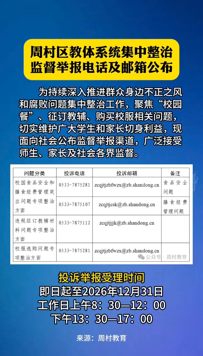 俺们淄博 | 周村家长注意!这些教育问题可举报鲁中晨报 | 14:13 原创大众新闻·鲁中晨报 微信扫码扫码下载客户端淄博市周村区教体系统聚焦“校园餐”、教辅征订、校服购买等问题,推进群众身边不正之风和腐败问题集中整治,面向社会公布监督举报电话及邮箱,广泛接受师生、家长及社会各界监督。即日起至2026年12月31日,可拨打投诉电话反映问题。(大众新闻·鲁中晨报记者 陆晓茜)