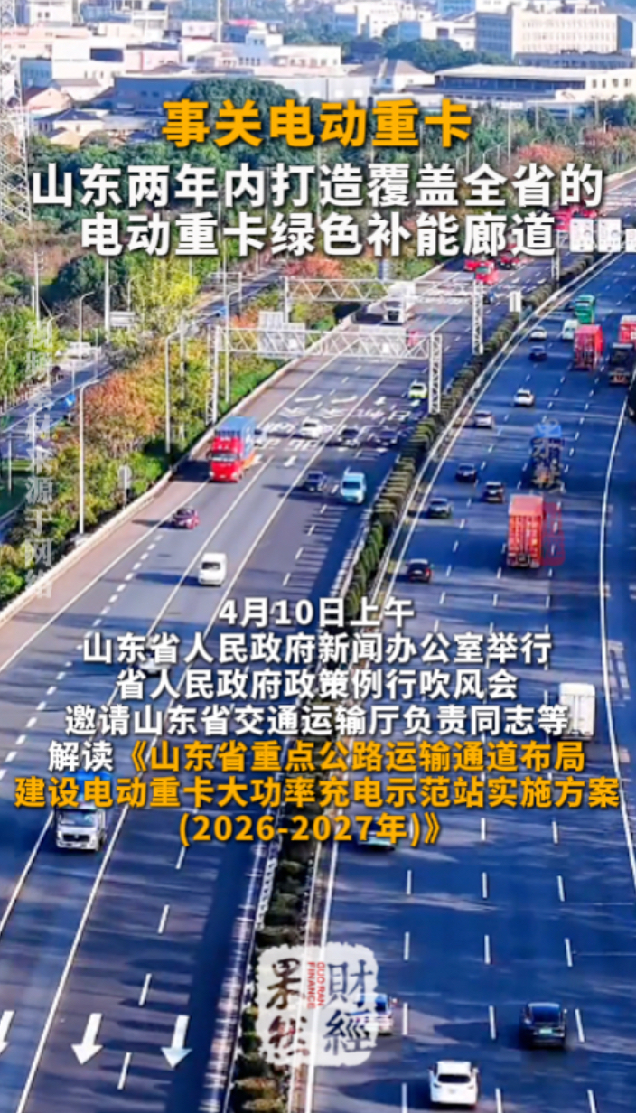 果然财经|政策利好!山东将打造覆盖全省的电动重卡绿色补能廊道齐鲁壹点 | 11:53 原创齐鲁晚报·齐鲁壹点客户端 微信扫码扫码下载客户端4月10日上午,山东省人民政府新闻办公室举行省人民政府政策例行吹风会,邀请山东省交通运输厅负责同志等解读《山东省重点公路运输通道布局建设电动重卡大功率充电示范站实施方案(2026-2027年)》。《实施方案》提出,利用2026-2027年两年时间,山东将全面开展重点路段示范站建设。