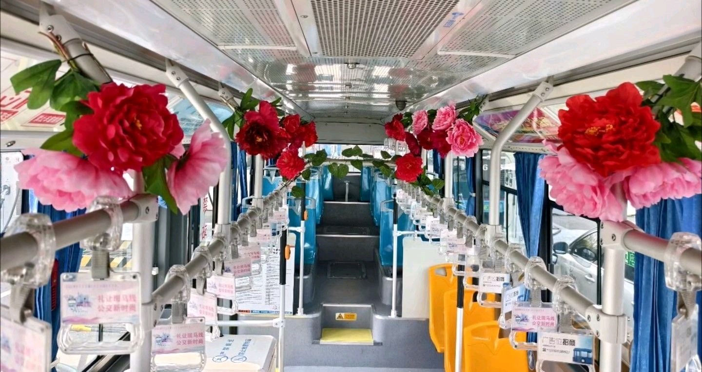 走进主题公交车厢,处处可见牡丹巧思点缀。扶手拉环间错落装点着仿真牡丹,嫣红、浅粉花瓣层层舒展,与窗外春光相映成趣;扶手旁藤蔓轻垂、绿意点缀,驾驶台前花艺摆件色彩纷呈,红的艳丽、白的淡雅、橙的温暖,让整段旅途都萦绕着浓郁的春日气息。