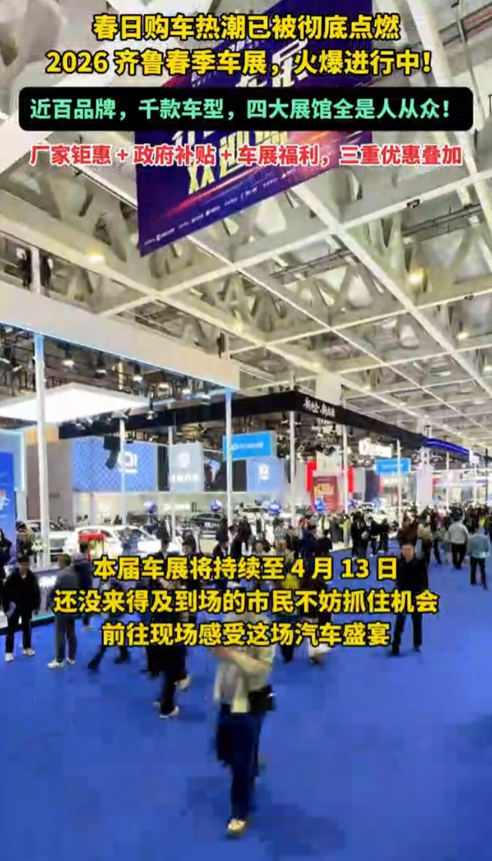 齐鲁春季车展人气爆棚,春日购车热潮持续升温 15:30 原创齐鲁晚报·齐鲁壹点客户端 微信扫码扫码下载客户端春风送暖,车市升温。4月9日—13日,以“乐驭齐鲁・焕新出行”为主题的2026齐鲁春季车展在山东国际会展中心盛大启幕。作为山东规模最大、历史最久、影响力最强的开年车市盛宴,本届车展一经开幕便引爆全城,四大展馆内人潮涌动、客流如织,上演“人从众”火爆盛况,全面点燃齐鲁百姓购车热情,奏响春季汽车消费最强音。 齐鲁晚报·齐鲁壹点 王劲松