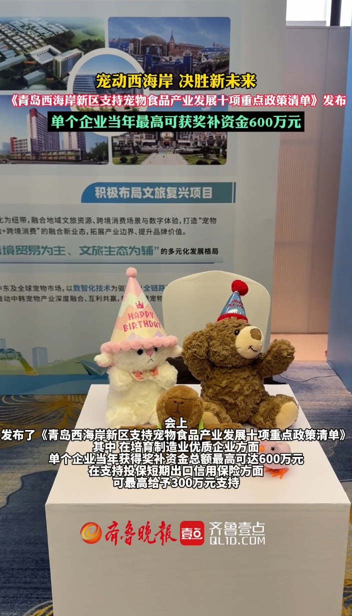 果然视频|最高600万!青岛西海岸宠物食品产业发展新政策来啦齐鲁晚报·齐鲁壹点客户端 17:19原创4月10日,青岛西海岸新区举办“宠动西海岸 决胜新未来”萌宠产业生态对话会,200余名嘉宾齐聚一堂,共谋产业发展新机遇。据悉,会上发布了《青岛西海岸新区支持宠物食品产业发展十项重点政策清单》。其中,在培育制造业优质企业方面,单个企业当年获得奖补资金总额最高可达600万元。 (齐鲁晚报·齐鲁壹点 徐润杰)