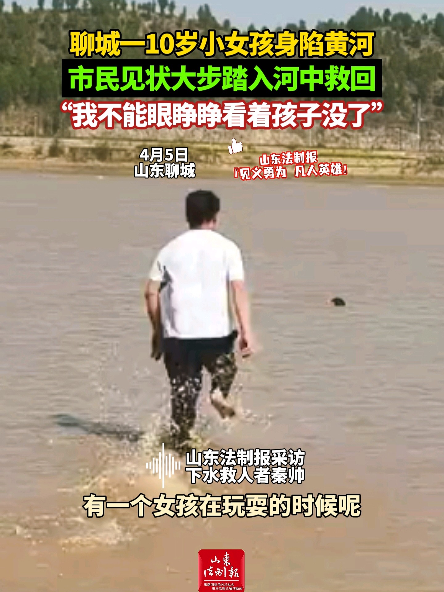 聊城一10岁小女孩身陷黄河,市民见状大步踏入河中救回,“我不能眼睁睁看着孩子没了” 19:49 原创山东法制报 微信扫码扫码下载客户端4月5日下午,聊城东阿一名10岁的小女孩在黄河边玩耍时被水冲走。岸边市民秦帅发现后,第一时间大步踏入河中,将女孩成功救回。回想起当时情景,他对记者说:“当时我对象也特别担心我,但我不能眼睁睁看着孩子就这样没了。”(大众新闻·山东法制报记者 羊文智)