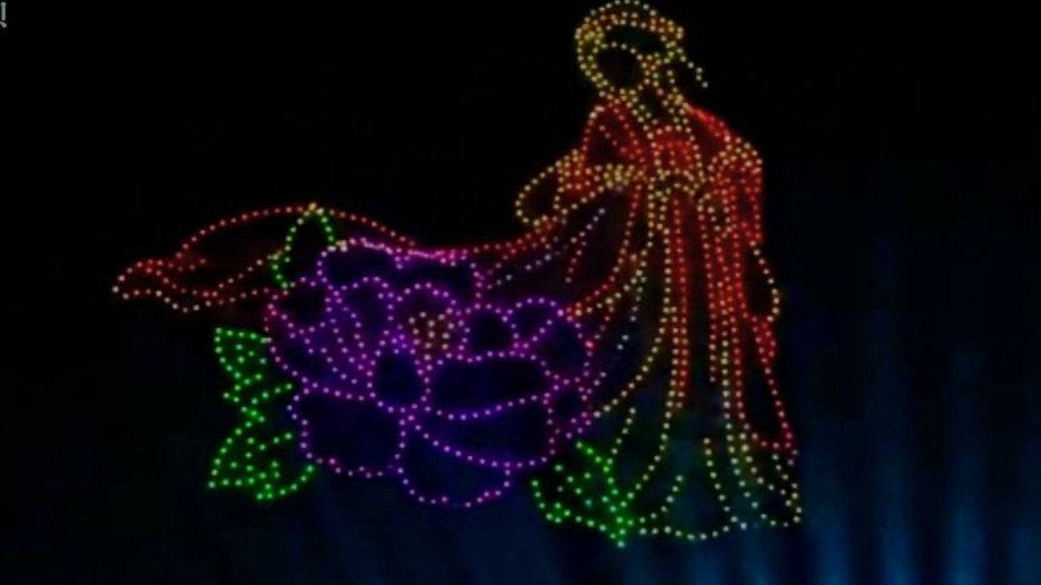 过程中,无人机编队随节目环节动态变换造型:从汉纹云章、牡丹花海,到梨园脸谱、祥云绕牡丹,每一次形态更迭都带来极致视觉冲击。