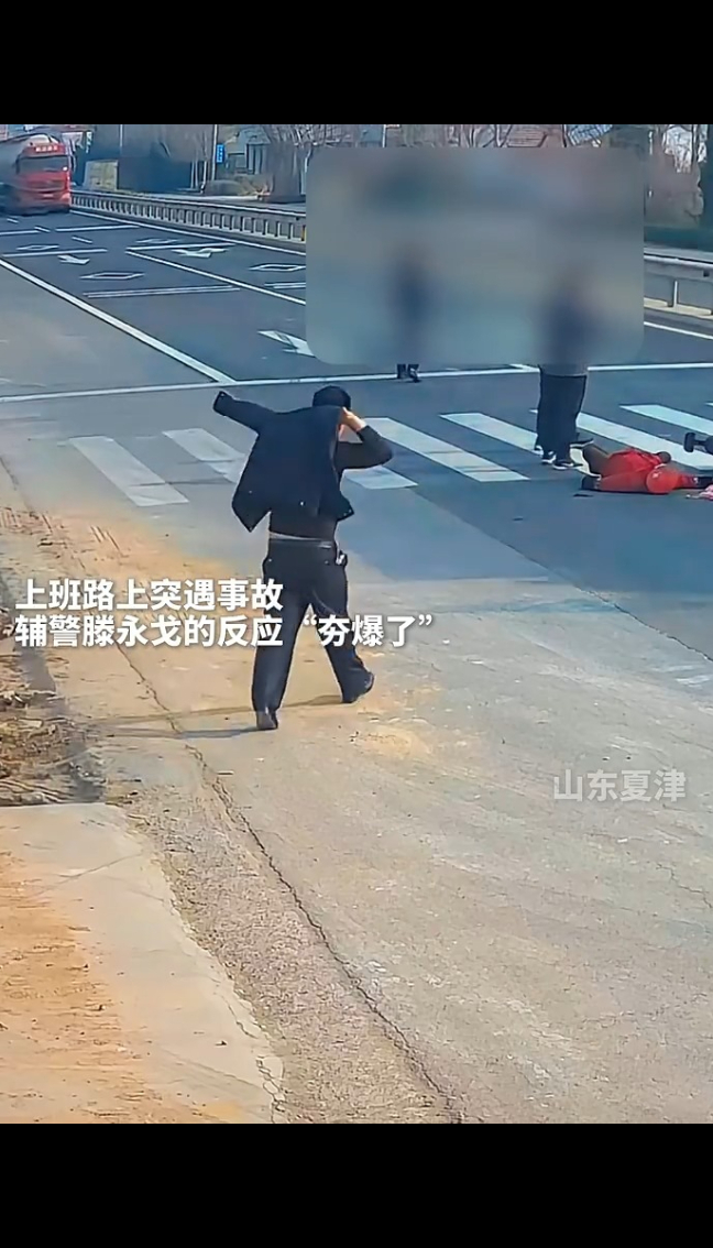 3月25日清晨,山东德州夏津县公安局新盛店派出所辅警滕永戈像往常一样驾车上班,突然发现派出所门前的国道上,一辆电动自行车倒在地上,一位老人趴在路中间。正值早高峰,车流密集,“不好,出事了!”滕永戈立即停好车,穿上警服跑向现场。